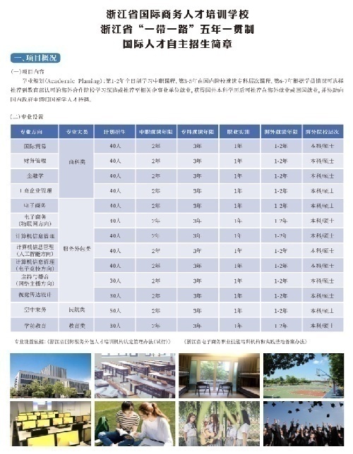 浙江省国际商务人才培训学院是浙江省“一带一路”五年一贯制国际人才学院,隶属于浙江省商务厅.学院含4大类,13个就业方向.毕业后可推荐到相关企事业单位就业,也可推荐到教育部认可的海外合作院校学习深造,获得本科学历后可推荐海外就业或回国就业,并申请向国内政府申请归国留学人才待遇.学院坐落在美丽的杭州.欢迎招生团队前来对接洽谈招生事宜