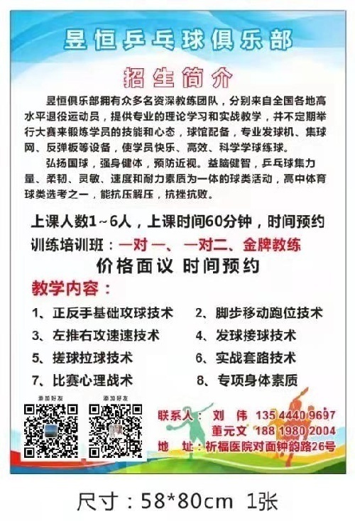 广州昱恒乒乓球俱乐部有限公司位于广州市番禺区钟村街道钟韵路24号新铧商务楼403.是一家以乒乓球培训,考级,技能提高,组织比赛的综合性公司,现有教练团队6人,乒乓球桌11张,占地面积500方。现面向社会招收4---15岁学员,从启蒙教学到基本战术到比赛的整体训练,招生人数50--100人,有意请与本球馆联系,联系人董先生