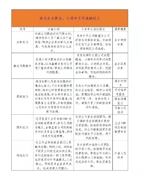 曌思教育主要培养企业医生,为企业家保驾护航,有完整的企业体检项目,企业管理处方和手术方案。个性标准化战略导航体系。企业医院的发起单位,目前拥有65项知识产权,是科技型中小企业,专注中国上市公司和中小企业的发展助力,放眼全球资本市场,以中国上市公司公司为中小企业提供决策标准,公司文化:正己利他:公司愿景:成为可传承的百年企业。