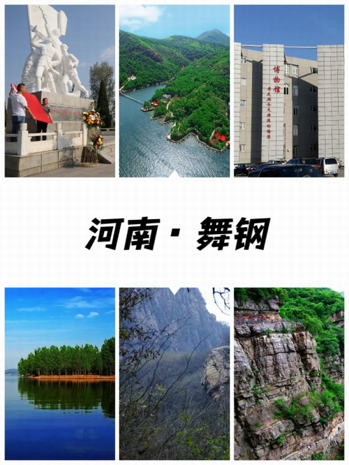 (概述图依次为:虎头山革命烈士陵园、二郎山、舞钢市博物馆、石漫滩、九头崖、灯台架)