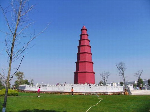 红塔通高30米,矗立在四座唐代小石塔正中间,红塔周围的四座唐代石塔的造型相似,高度也基本相同,高约3米多。