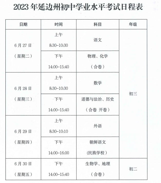 吉林延边中考时间2023年具体时间:6月27日-29日