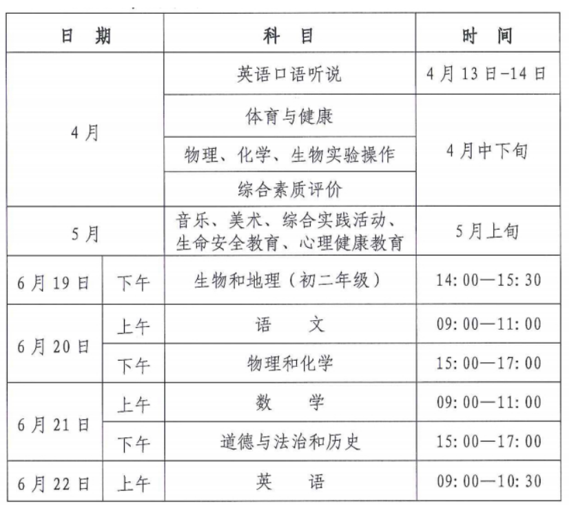 注:笔试时间除初二生物和地理、初三英语科目时限90分钟外,其他学科考试时限均为120分钟。