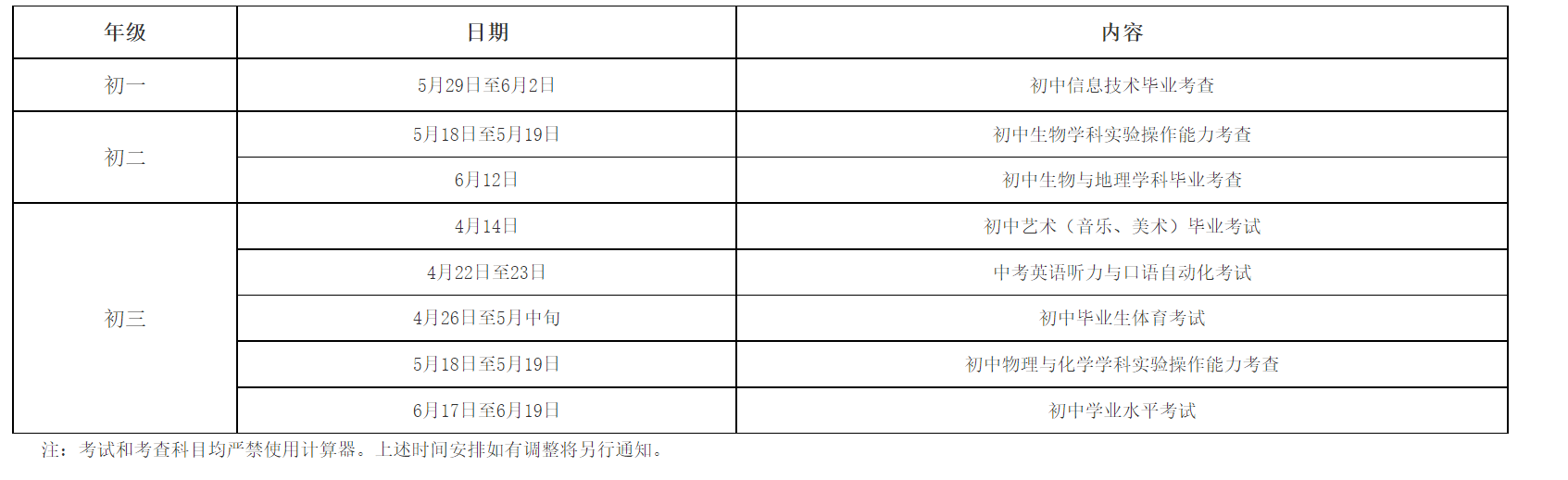 3.考试形式及用时。语文、数学、英语(书面考试)、物理、化学、历史实行闭卷考试,道德与法治实行开卷考试,英语听力口语自动化考试按省教育厅有关文件执行,体育考试方案另发。考试用时语文为150分钟,数学为120分钟,英语(书面考试)、物理、化学均为100分钟,道德与法治、历史均为50分钟。