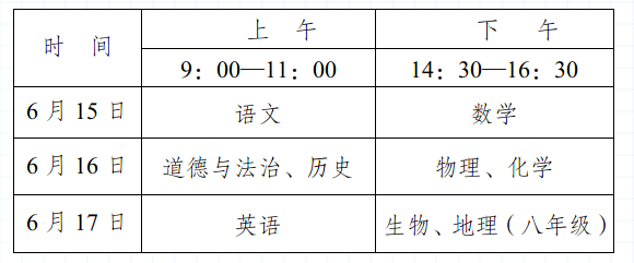 经市招委、市教育体育局研究决定,2023年全市初中学业水平考试暨高中阶段学校招生考试(统称“中考”)报名时间为4月3日至4月10日;志愿填报时间为5月4日8:30至5月11日18:00;体育与健康学业水平考试及实验操作考试在中考报名后开始,5月10日前结束,具体时间由各县(市、区)教育行政部门安排;各科目笔试时间为6月15日至17日,具体安排如下: