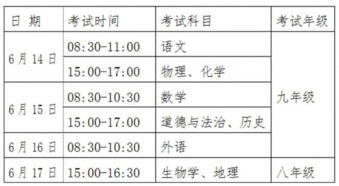 九年级。语文、数学各150分、外语120分(其中听力测试20分);道德与法治80分、历史70分,合卷计150分;物理70分、化学40分,合卷计110分;体育与健康60分;理科实验操作10分,物理、化学二选一。以上科目考试成绩计入高中招生录取总分。