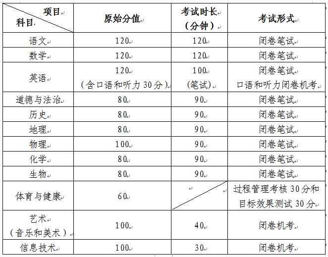 2020级学生考试科目:语文、数学、英语(含口语和听力)、道德与法治、历史、物理、化学、体育与健康、艺术(音乐和美术)、实验操作(物理或化学)。