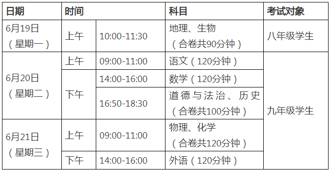 湖北咸宁2023年中考时间安排(6月19日-6月21日)