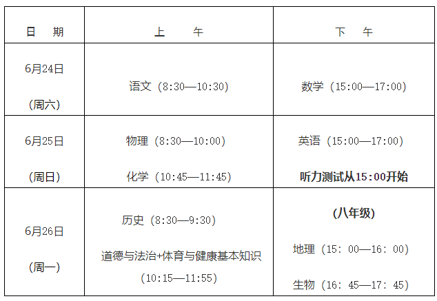 1.2023年中考省级统一考试各学科考试内容以《福建省教育厅关于印发福建省初中语文等九学科教学与考试指导意见的通知》(闽教基〔2017〕1号)为准,具体科目考试时间安排如下: