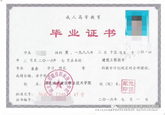 学生在规定的修业年限内,完成教学计划规定的课程,考核合格,经毕业资格审查合格,准予毕业,由湖北城市建设职业技术学院颁发国家承认的成人高等学历毕业证书,教育部电子注册,“中国高等教育学生信息网”备案查询。