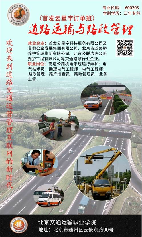 我们为北京交通路政行业企业,培养从事高速公路机电系统运行维护(电气技术员—电气助理工程师—电气工程师)与路政管理(路产巡查员—路政管理员—技术主管)的技术技能人才。 | |