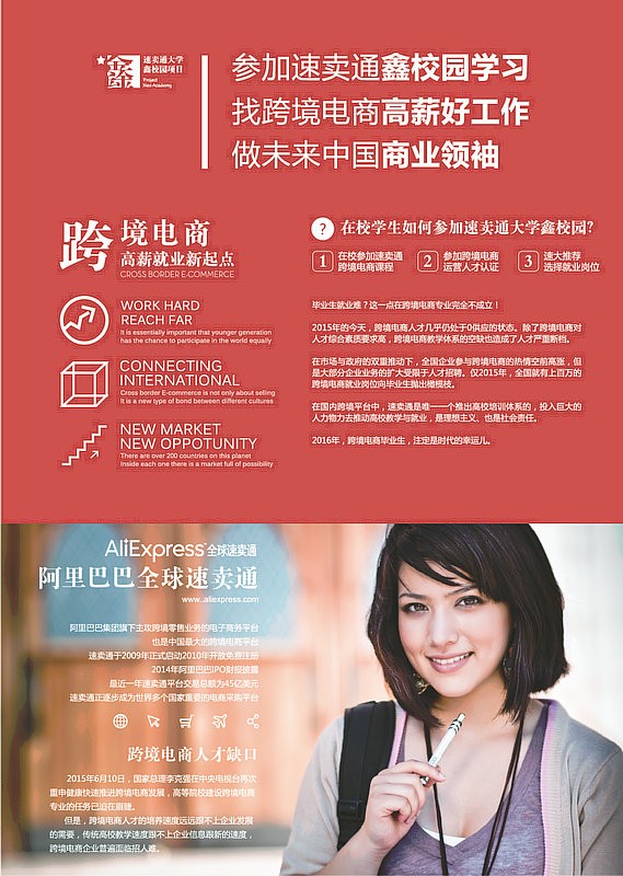 信息工程学院于2016年7月与阿里巴巴速卖通大学签订鑫校园合作项目,现已将速卖通跨境电商教学平台纳入电子商务专业实训教学计划,通过实训学习的同学可考取阿里巴巴速卖通大学跨境电商运营专员证书并进入速卖通人才库,人才库会自动推荐同学们在全球速卖通联盟企业就业,毕业生也可以选择在全球速卖通平台自主创业。