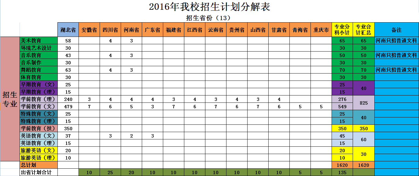 湖北幼儿师范高等专科学校2016年高招计划