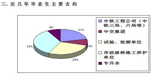 毕业生主要到交通建设行业的施工部门、路桥养护部门、监理公司、检测公司等从事公路、桥梁、城市道路工程的施工、试验、检测、监理、造价和技术管理等工作。