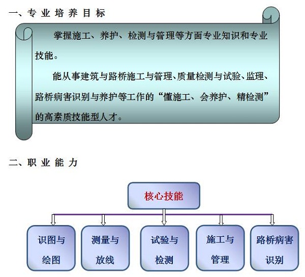 能胜任道桥现场施工及管理等岗位,具有首岗适应性、多岗迁移性、可持续发展能力的高素质技能型人才。
