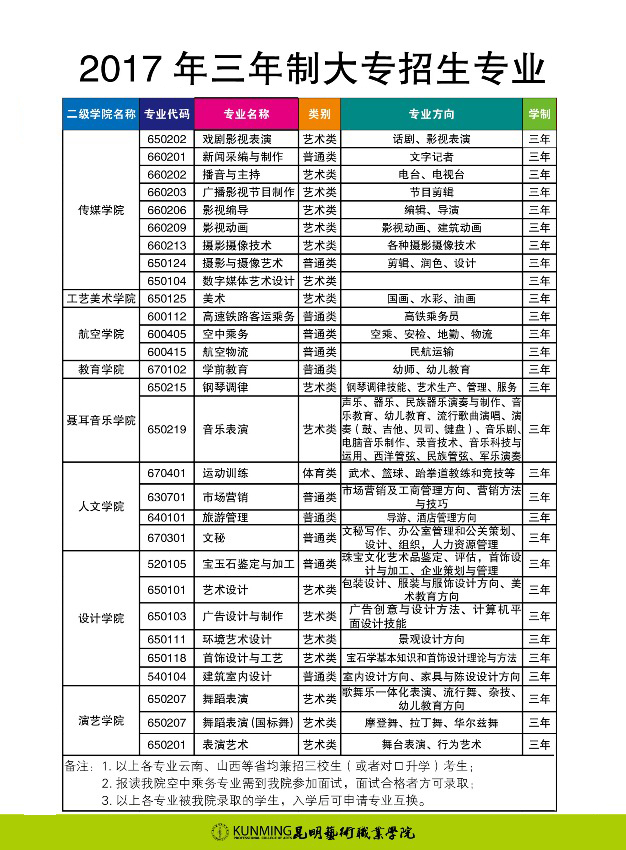 昆明艺术职业学院2017年三年制大专招生简章