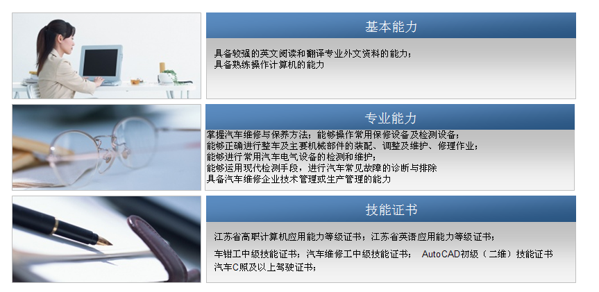 具有较强的汽车整车销售的能力;具有汽车售后服务能力;具有旧机动鉴定估价能力;具有配件管理及其营销的能力;具有一定的汽车故障诊断能力;具有一定的汽车检测与维修能力;具有工程语言图文表达及一定的社会活动的基本能力;具有借助词典阅读本专业翻译本专业英文资料、并有初步的英语会话的能力;