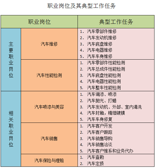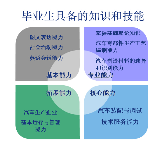 具有良好的职业道德和创新精神,能胜任汽车制造、装配、运行管理和售后服务等工作适应生产、建设、管理、服务第一线需要的“能胜岗+能转岗”的高素质、可持续发展的技术技能型人才。