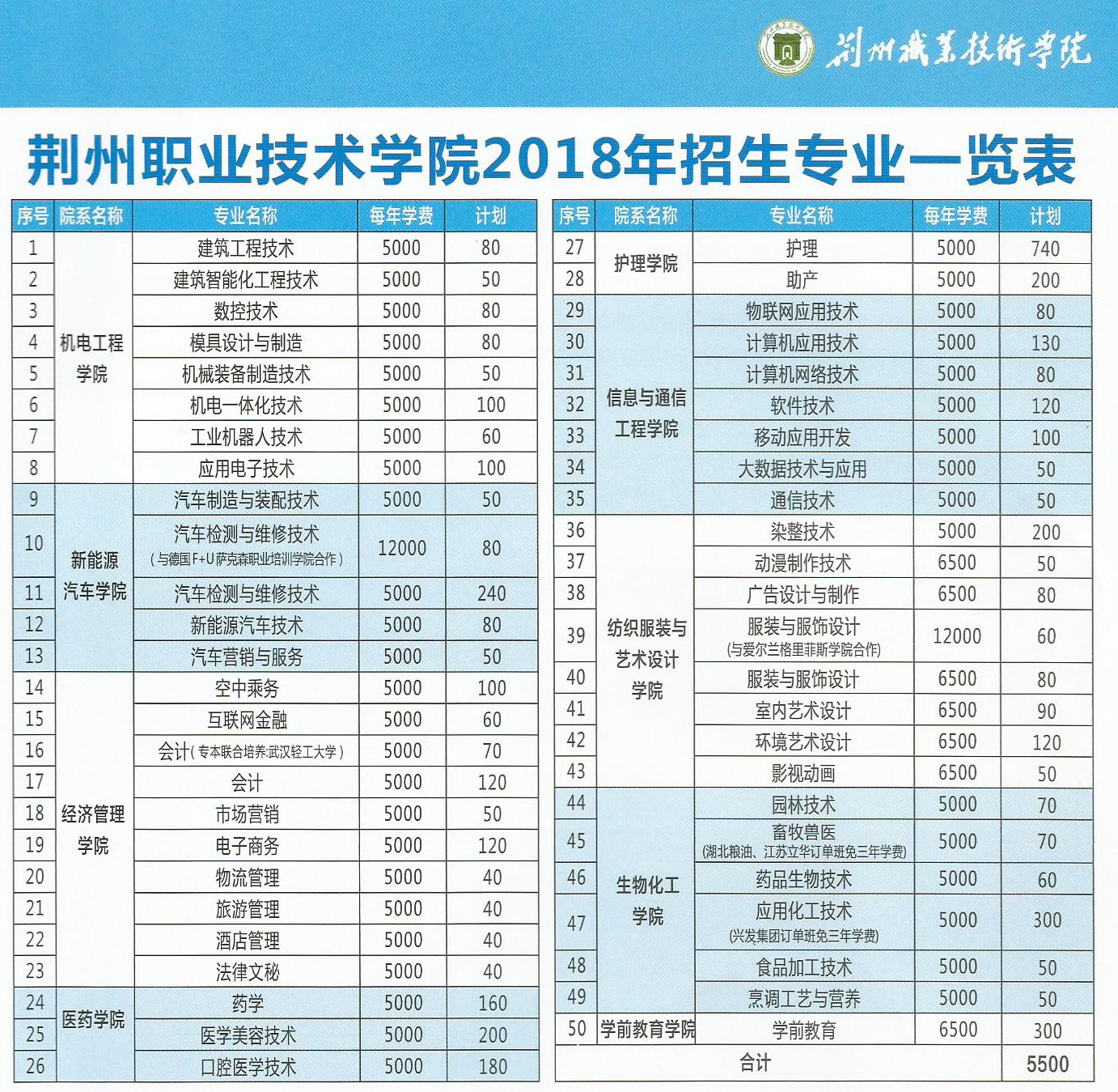 荆州职业技术学院2018年招生专业目录