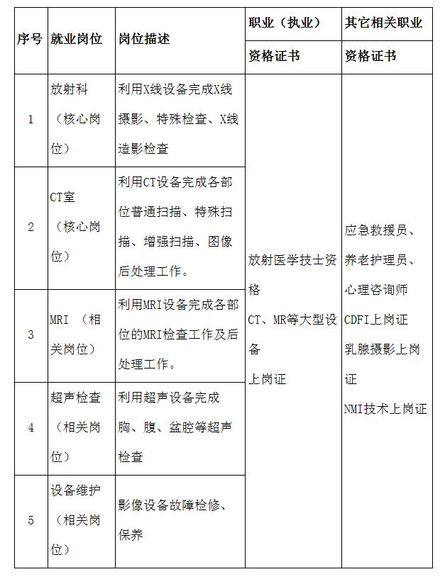 本专业主要面向中等规模医疗卫生机构或医学影像中心,培养具有扎实医学影像技术专业知识及较强动手能力,在放射科、CT室、MRI室、超声科从事现代医学影像检查技术、医学影像设备保养与维护工作的技术技能人才。