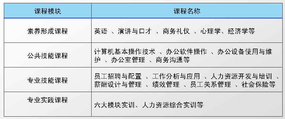 培养目标:本专业主要面向工商企事业单位、人才交流中心、人力资源咨询机构等,培养掌握工作分析、员工招聘、员工培训、绩效考核、薪酬管理、员工关系管理等核心技能,具备开发与管理人力资源的实际操作技能,能从事工作分析、组织设计、人员招聘与开发、绩效与薪酬管理、员工关系管理、管理文员等工作的高素质技能型人才。