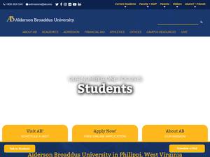 Alderson Broaddus大学成立于1871年,是一所非营利性私立多学科高等教育机构,位于西弗吉尼亚州中部小镇Philippi(人口2500-9999)的农村地区。Alderson Broaddus大学(A-B)经高等教育委员会正式认证,是一所规模非常小(uniRank招生范围:1000-1999名学生)的男女同校美国高等教育机构,正式隶属于基督教浸礼会。Alderson Broaddus大学(A-B)提供获得官方认可的高等教育学位的课程和计划,如若干研究领域的学士前学位(即证书、文凭、副学士或基础)、学士学位、硕士学位。有关更多详细信息,请参见下面的uniRank学位等级和学习领域矩阵。这所拥有149年历史的美国高等教育机构根据入学考试和学生过去的学习成绩和成绩实行选择性录取政策。入学率在40-50%之间,这使得这家美国高等教育机构成为一所普通的选择性院校。欢迎国际学生申请入学。A-B还为学生提供若干学术和非学术设施和服务,包括图书馆、住房、体育设施、经济援助和/或奖学金、出国留学和交流计划、在线课程和远程学习机会,以及行政服务。