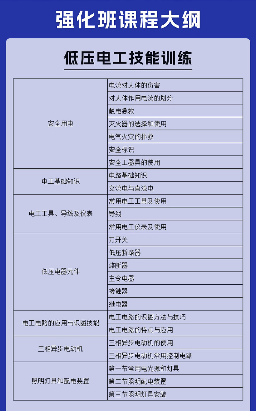 1、强化班:主攻低压电工技能训练及可编程控制系统集成,包括安全用电、电工基础知识、低压电器元件、电工电路的的应用与识图技能、三相异步电动机、PLC入门知识、G120变频器、工业应用等。