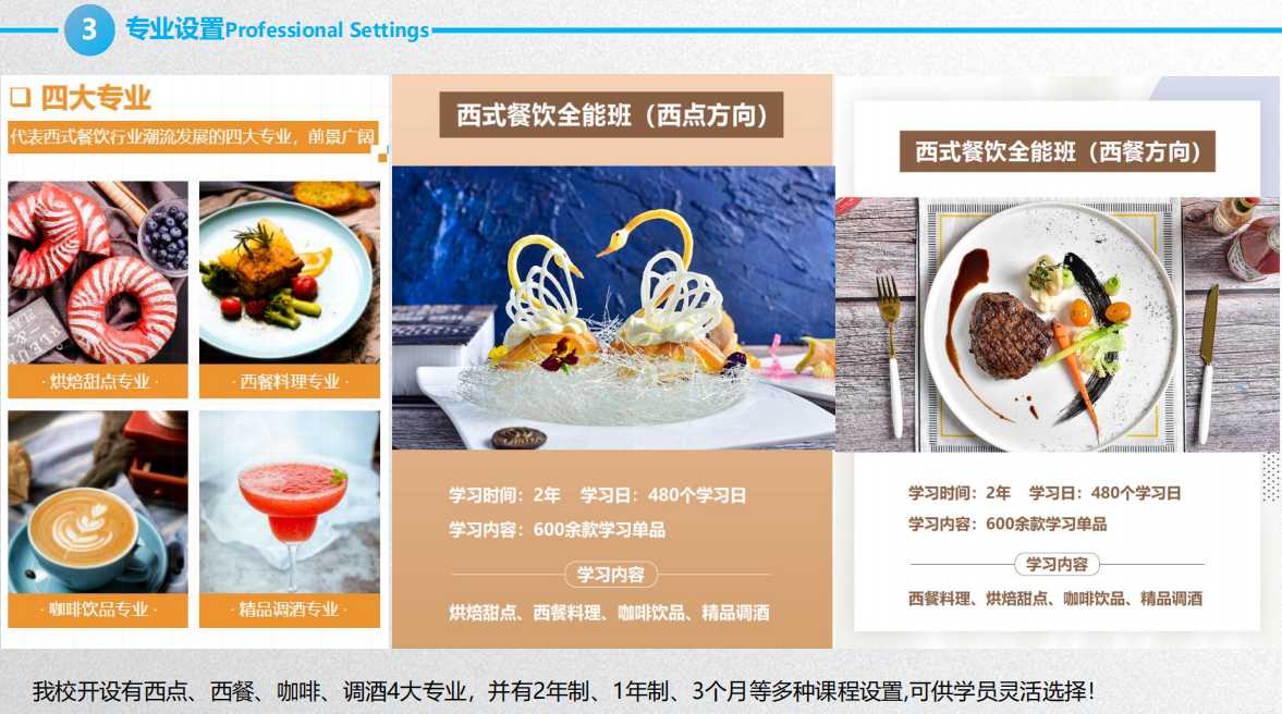 成都欧米奇西点西餐学院成都欧米奇西点西餐学院隶属于行业首家上市品牌、中国最大的职业技能教育提供商——中国东方教育控股有限公司,母公司于 2019 年 6 月 12 日在港交所成功上市,成为港股教育板块中最大的职业技能培训企业;2020 年春节欧米奇登陆央视,被央视称为“更专业的西点烘焙学校”。成都欧米奇位于成都市金牛区迎宾大道 3 号,教学面积达 4000 平米,是一家专注于西点西餐教育的品牌院校。学校以“大师之道,精益求精”的西点精 神作为自身信仰,不断提升教学品质,持续丰富及创新课程,接轨国内外市场, 提升市场领导地位和声誉,致力于打造更专业的西点烘焙学校,培养了一批又 一批真正具有国际水平的中国西点师。学校开设有烘焙甜点、西餐料理、精品调酒、咖啡饮品四大热门专业,在师资方面,学校汇聚了一批来自海内外的行业大师,师资力量雄厚,这也是成都欧米奇屹立于行业之巅的核心力量。各大专业的讲师均拥有精湛的专业技能和资深的行业经验,他们为成都欧米奇的教学体系注入了强大力量,带来更多行业前沿的理论和技术,打造的精品课程既符合国际水准,又符合西式餐饮行业发展的主流趋势,强大的教学力量成就更专业的西点西餐学院。教学品质与国际接轨的第一步,就是教学设备的国际化标准。欧米奇在教学设备和原材料方面,配置了国际先进的教学设备,以工作环境为蓝本,让教学更加现代化,营造 更多>>>