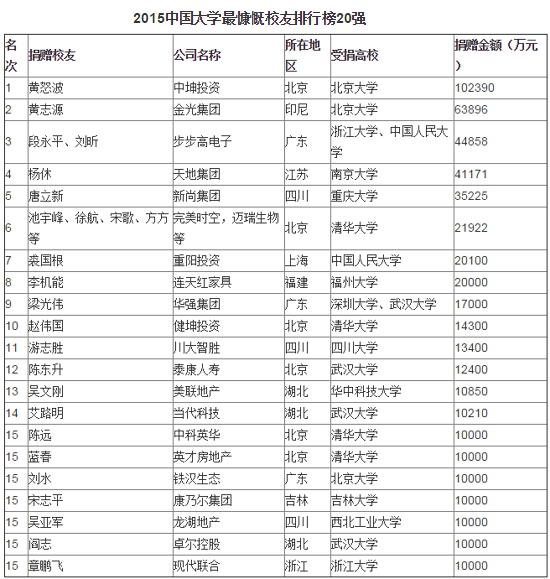 报告显示,在最新2015中国大学最慷慨校友排行榜中,北京大学校友、中坤投资集团黄怒波累计向母校捐赠10.24亿,以绝对的优势雄居艾瑞深中国校友会网2015中国大学最慷慨校友排行榜100强榜首,创造中国大学校友个人捐赠总额的最高纪录,勇夺“2015年中国大学最慷慨校友”称号。北京大学校友、金光集团黄志源屈居第二,累计向母校捐赠6.39亿;步步高的段永平合计向母校中国人民大学和浙江大学捐款4.47亿,名列第三;南京大学校友、天地集团杨休捐赠4.12亿,位居第四;重庆大学校友、新尚集团唐立新捐款3.52亿,名列第五;清华大学池宇峰、徐航、宋歌和方方等校友,合计向清华大学捐赠2.19亿元,位居第六;中国人民大学校友、重阳投资裘国根捐款2.01亿,名列第七;福州大学校友、连天红家具李机能捐款2.00亿,位列第八;华强集团梁光伟合计向母校深圳大学和武汉大学捐款1.70亿,位居第九;健坤集团赵伟国累计向母校清华大学捐赠1.43亿,排名第十。