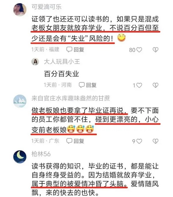 还有的网友表示,自己妹妹假期去打工,担心的就是这个,因为20岁的大学生是最好骗的,不得不承认,评论区的人还是很清醒的,她们认为无论是不是老板娘,都需要读书,一切都需要等到毕业再说。