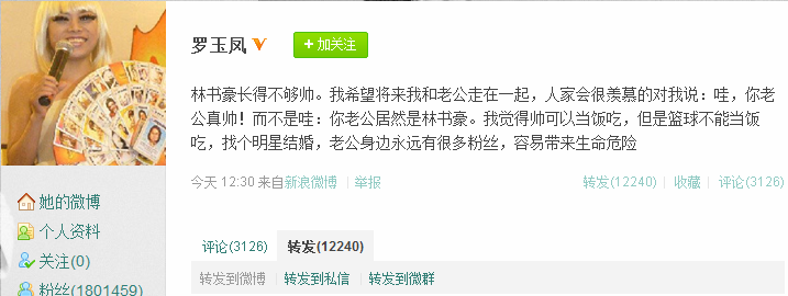 凤姐(罗玉凤)自一出道,就叫嚣着要找的男朋友需要满足三个条件,一是哈佛毕业,二是身高185cm以上,三是高富帅,而近日刮起了一股“林旋风”的小伙子林书豪似乎正好符合了凤姐的要求,一时间网友们纷纷猜测,林书豪是否会成为凤姐的“白马王子”,是否“此劫难逃”,而凤姐则在2月25日中午时分,发表了微博澄清,自己觉得林书豪不够帅,看来,林旋风可以安心征战了。
