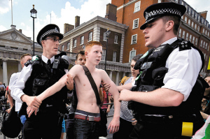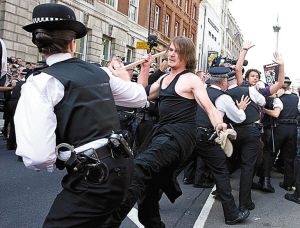 在伦敦,数万名罢工者及其支持者在市中心游行抗议。英国媒体记者当日中午赶到议会大厦时,警方已在大厦前设置路障并实行警戒,周边一些道路也被封闭。当天中午12时40分左右,游行队伍从白厅大街方向涌出,人们打着各种各样的标语,上书“停止削减”、“卡梅伦该下台”、“要公平的养老金”等,高喊反对政府养老金制度改革计划的口号。游行者包括警察、政府部门工作人员、教师等,一些人还带着孩子行走在队伍之中。