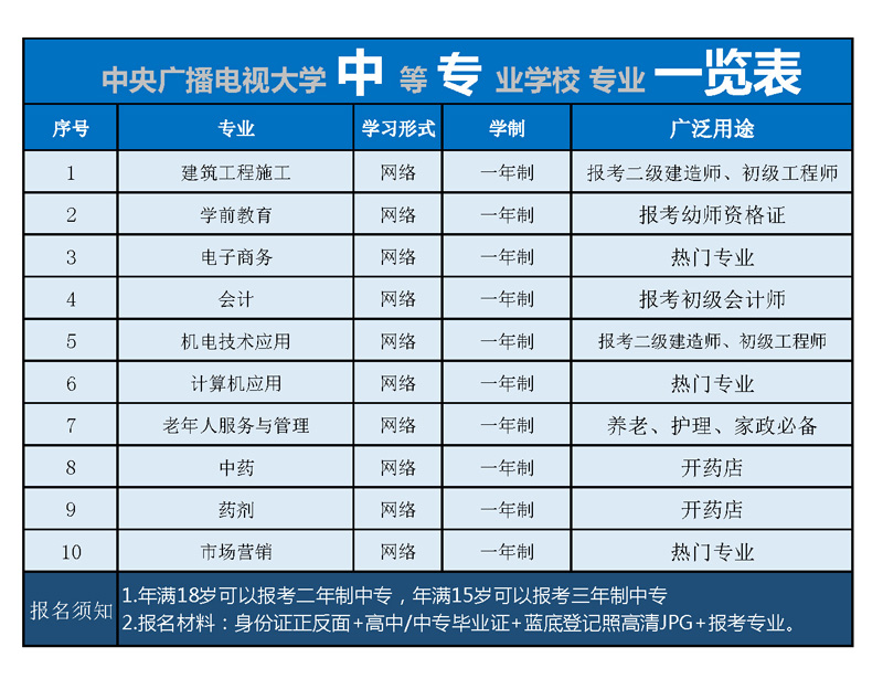 电大中专的专业包括机电加工、电子应用技术、物流管理、市场营销、财务会计、法律、电子商务、计算机应用等。此外,还有特色专业,如汽车运用与维修、烹饪、学前教育、工艺美术、电子商务、计算机平面设计、客户信息服务(呼叫中心方向)、旅游服务与管理、珠宝加工与鉴定、畜牧兽医、保健护理、机电一体化、石油开采、动漫设计与制作等。