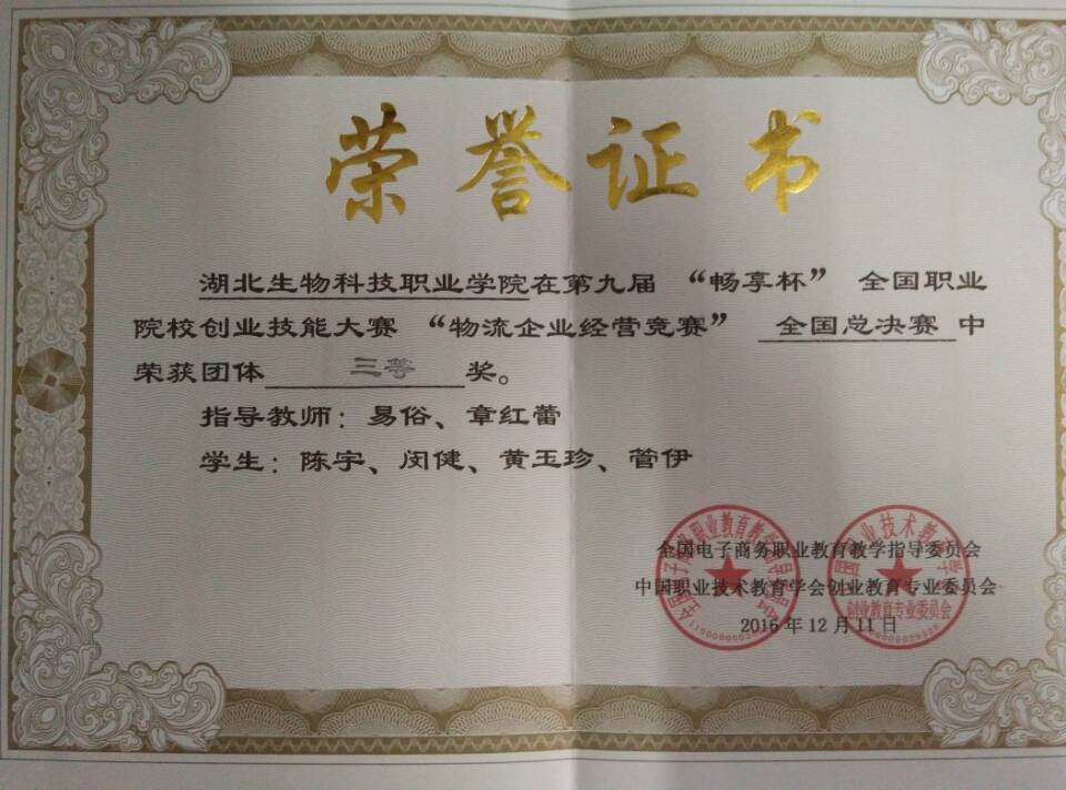 2016年第九届“畅享杯”全国职业院校创业技能大赛“物流企业经营竞赛”全国三等奖