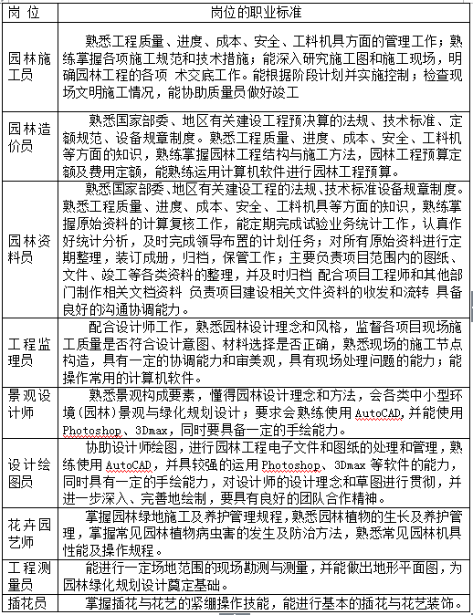 1 | 景观方案设计人员 | 在景观、建筑、规划等企事业单位从事景观设计工作;物业管理公司、花卉租售公司从事环境改造设计、展会植物布景设计等;负责与景观施工企业、设计单位沟通协调。 | 1.熟悉景观设计相关规范; 2.会踏勘现场、搜集资料、善于了解业主要求,并能根据环境功能、投资情况、地方特点和人文要求等,确定合理的方案设计原则; 3.能对场地现状进行分析,找出可利用资源或需解决的问题; 4.能提出景观规划设计原则,针对方案设计难点提出解决方案; 5.能把握方案设计原则,并贯穿到方案设计中; 6. 熟悉各类造景材料的应用,能根据造价要求选择设计风格、选择适当的材料和工艺; 7.会做各类常见绿地的规划与设计; 8.能根据景观总体风格设计景观建筑小品,能够进行各类环境景观的设计,能用基本的设计手段完成工作; 9.会做景观设计及其配景的平、立、剖面和效果图的手绘表现; 10.能熟练使用AutoCAD,进行景观方案设计的绘制,并能够使用Photoshop、3Dmax画出设计效果图; 11.明确设计步骤、要求、说明与图纸编制,能进行方案文本设计、制作; 12.会撰写方案设计说明书,并会基本的印刷和装订; 13.善于将自己的设计思想和表现图纸圆满的讲解出来,并能吸收专家、领导和甲方单位的意见,进行完善和深化; 14.能与施工图设计人员沟通,贯彻方案设计意图,细化方案设计。 |