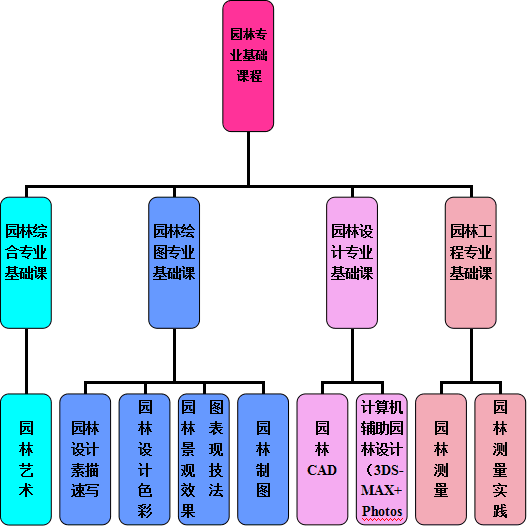 造型基础、设计构成、景观效果图表现技法、景观制图、景观花卉、景观树木、技能基础1(AutoCAD)、技能基础2(3DSMax))、技能基础3(Photoshop)、技能基础1(Sketchup)、景观规划设计、景观建筑与小品设计、景观施工图设计、景观工程招投标与概预算等。