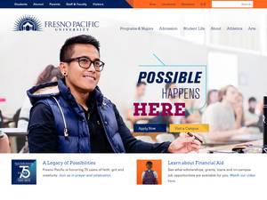 弗雷斯诺太平洋大学(Fresno Pacific University)成立于1944年,是一所非营利性私立高等教育机构,位于加利福尼亚州弗雷斯诺中等城市(人口25万-49万9999人)的市区。该机构还在以下地点设有分校:贝克斯菲尔德,维萨利亚,默塞德。弗雷斯诺太平洋大学(FPU)是由WASC高级学院和大学委员会(WASC Senior College and University Commission)正式认可的一所小型(uniirank注册范围:5,000- 5999名学生)男女同校的美国高等教育机构,正式隶属于基督教-门诺派宗教。弗雷斯诺太平洋大学(FPU)提供的课程和项目导致在几个研究领域的官方承认的高等教育学位。详情请参阅下面的uniRank学位水平和学习领域矩阵。这所拥有76年历史的美国高等教育机构有一个基于入学考试和学生过去的学术记录和成绩的选择性录取政策。录取率范围是80-90%,这使得这所美国高等教育机构是一个最低选择的机构。欢迎国际学生申请入学。FPU还为学生提供一些学术和非学术设施和服务,包括图书馆、住房、体育设施、财政援助和/或奖学金、海外学习和交换项目、在线课程和远程学习机会,以及行政服务。