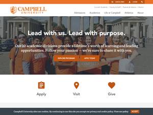 坎贝尔大学成立于1887年,是一所非营利性私立高等教育机构,位于北卡罗莱纳州Buies Creek(人口范围为2500-9999人)中等城市的郊区。坎贝尔大学(CU)是一所中等规模(uniRank招生范围:7000-7999名学生)男女同校的美国高等教育机构,正式隶属于基督教浸礼会,由南方学院协会学院委员会正式认证。坎贝尔大学(CU)提供获得官方认可的高等教育学位的课程和计划,如若干研究领域的学士前学位(即证书、文凭、副学士或基础)、学士学位、硕士学位、博士学位。有关更多详细信息,请参见下面的uniRank学位等级和学习领域矩阵。这所拥有133年历史的美国高等教育机构根据入学考试和学生过去的学习成绩和成绩实行选择性录取政策。入学率在70-80%之间,这使得这家美国高等教育机构在某种程度上具有选择性。国际申请人有资格申请入学。CU还为学生提供若干学术和非学术设施和服务,包括图书馆、住房、体育设施、经济援助和/或奖学金、出国留学和交流计划、在线课程和远程学习机会,以及行政服务。
