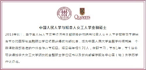 2013年8月,中国人民大学汉青经济与金融高级研究院(以下简称“汉青研究院”)与加拿大女王大学史密斯商学院(以下简称“史密斯商学院”)联合举办的国际级金融硕士学位项目获得教育部批准(批准书编号:MOE11CA1A20131441N),成为中国人民大学金融学科领域第一个获得教育部批准的中外合作办学项目。