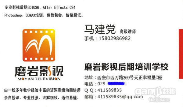 西安磨岩影视后期培训中心成立于2006年,由马建党老师成立。自成立多年来、经过不断发展、现汇聚了一批高素质的专业人才,组建了一支实力雄厚、经验丰富的专业的制作和教学师资团队。工作室秉承“诚信、专业、创新、共赢”的运作理念,以“用心服务、精益求精、客户至上”为宗旨。主要培训影视后期制作、平面设计、室内效果图和摄影摄像专业,并承接各类广告专题宣传片、会议庆典演出及婚礼婚庆、寿宴生日聚会、同学会等内容摄影摄像、后期制作于一体的制作中心。 培训中心网站 宣传视频广告 更多>>>